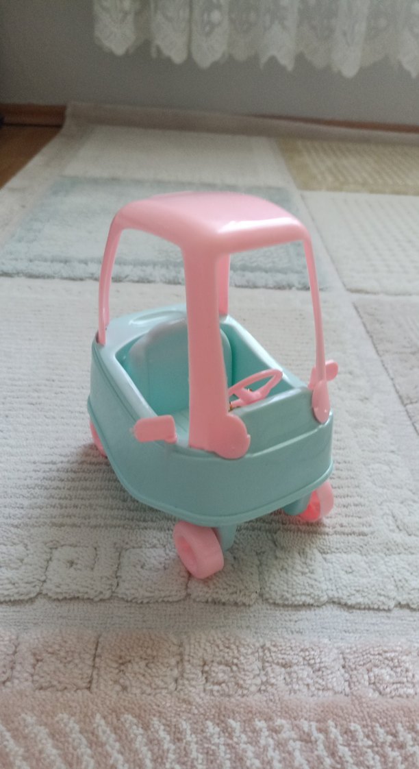 Pastel pembe ve mavi renkte, tavanı ve direksiyonu olan basit tasarımlı oyuncak araba.
