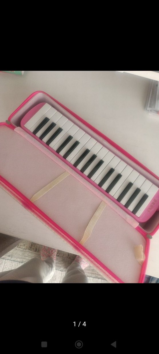 Pastel pembe renkli melodika, siyah ve beyaz tuşlara sahip, elastik bantlı uyumlu pembe kılıf içinde saklanır. hijyenik açıdan ağızlık ve hortumu eklemedim