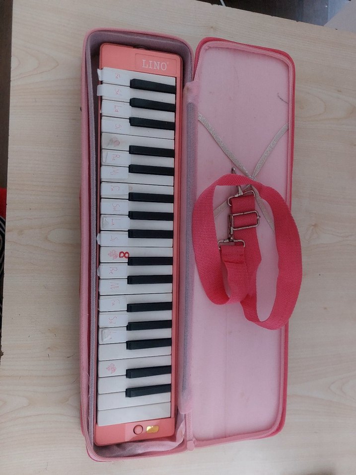 Pastel pembe renk melodika, siyah beyaz tuşlara sahip. Yanında uyumlu taşıma çantası ve askısı bulunur. görselde görüldüğü gibidir.. başka parçası yoktur