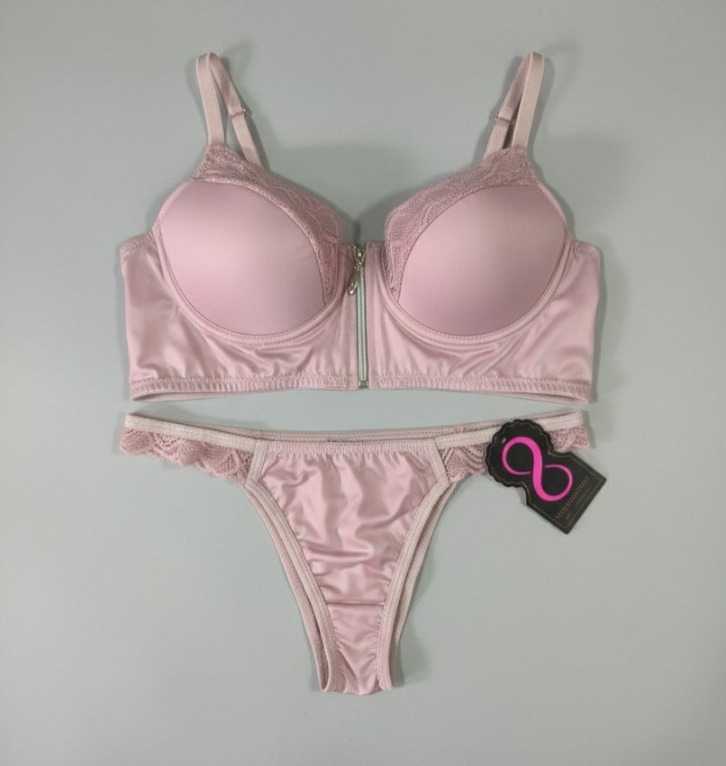 Pastel pembe renkte, kısa boylu, ön fermuarlı ve zarif dantel detaylı, çağdaş tarzda glamor tarzda sütyen takımı.
