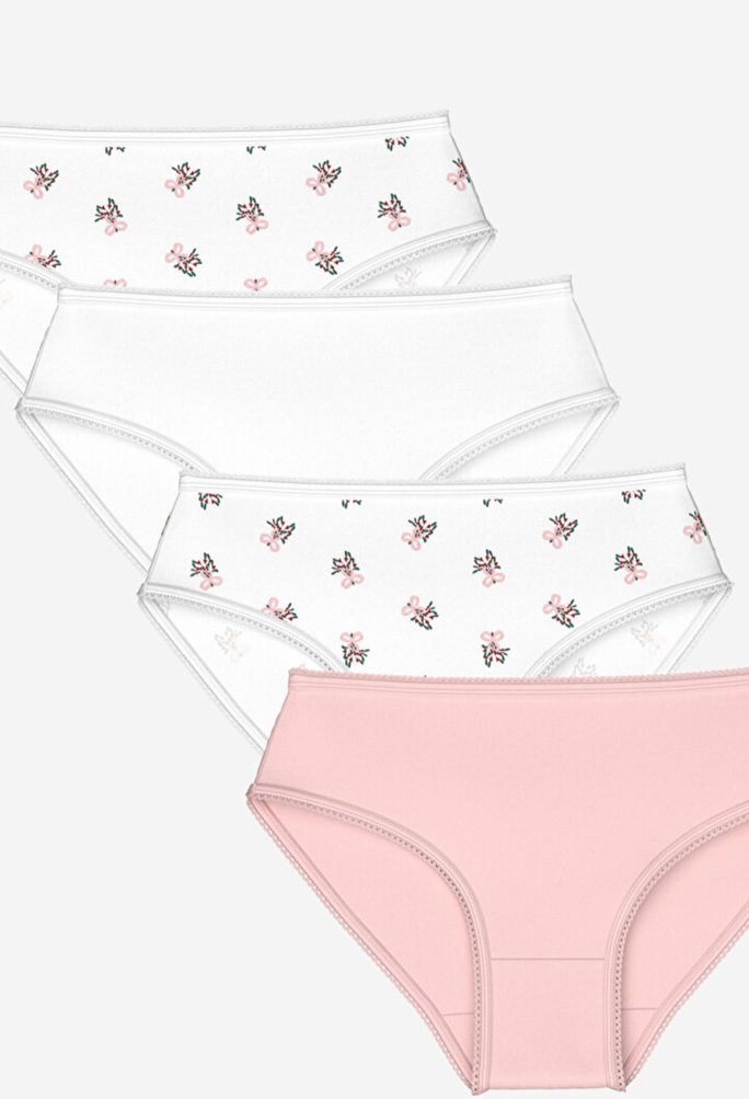 Pastel pembe ve beyaz mini iç çamaşırlarından oluşan set. Bazıları küçük çiçek desenli. Rahat ve sade tasarım.