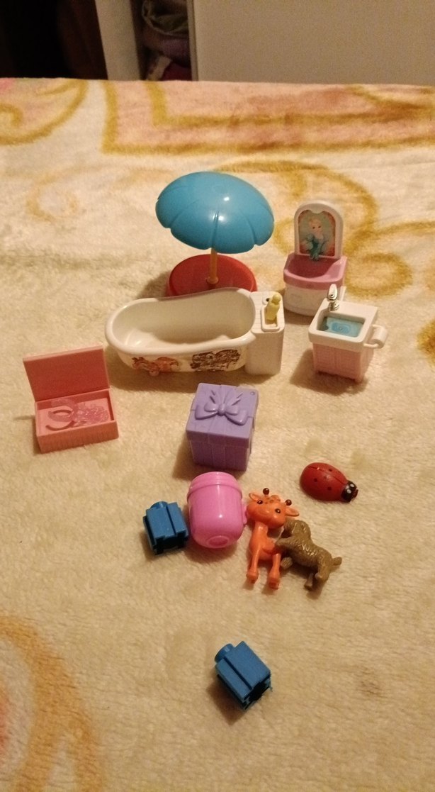 Pastel pembe renkli, küvet, şemsiye, küçük hayvanlar ve minyatür aksesuarlar içeren oyuncak seti. Hayal gücünü destekler.