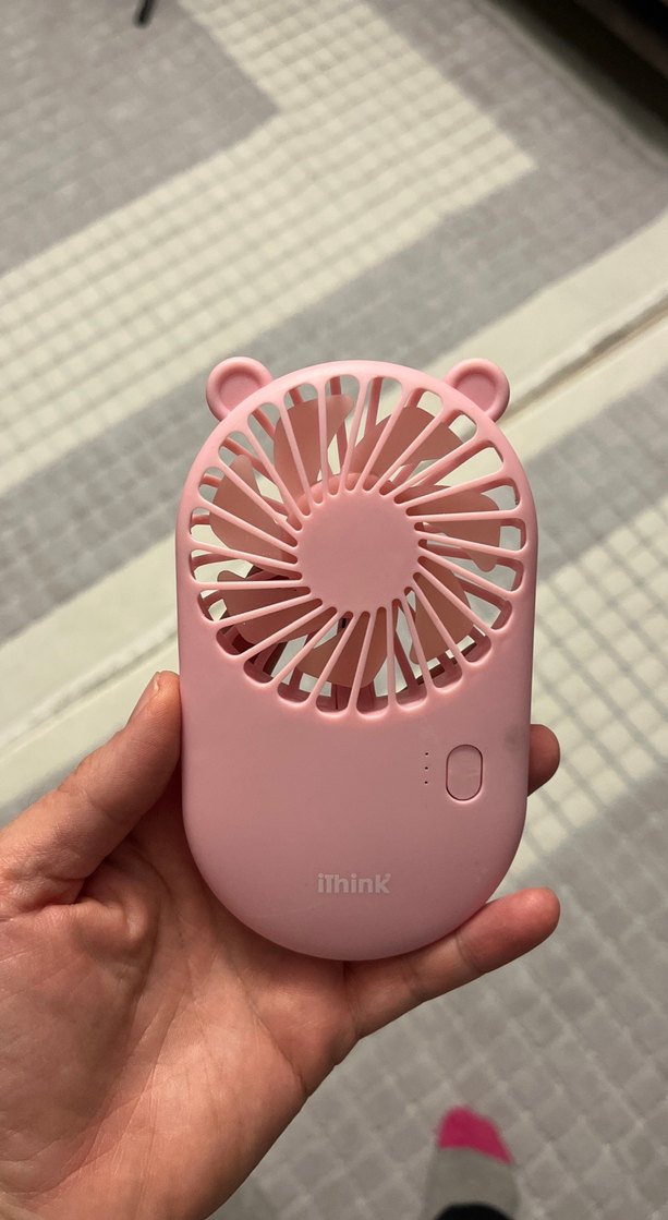 Pastel pembe renkte, ayıcık kulaklı, tek tuşlu taşınabilir mini fan. Marka: iThink. ️çalışıyor hiç kullanmadım. hediye geldi.