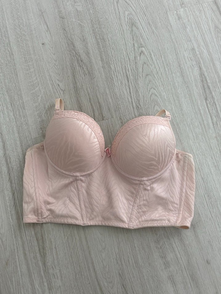 Pastel pembe renkte, modern klasik tarzda, desen içermeyen ve midi uzunlukta rahat destek sağlayan sütyen.