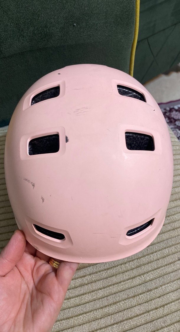 Pastel pembe renkli, tokalı ve havalandırma deliklerine sahip motosiklet kaskı, rock punk tarzını yansıtıyor.