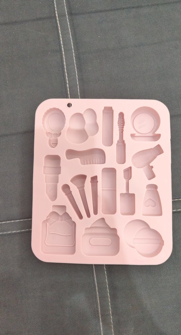 Pastel pembe renkte, çeşitli makyaj aletleri şeklinde bölmeleri olan mum kalıbı
