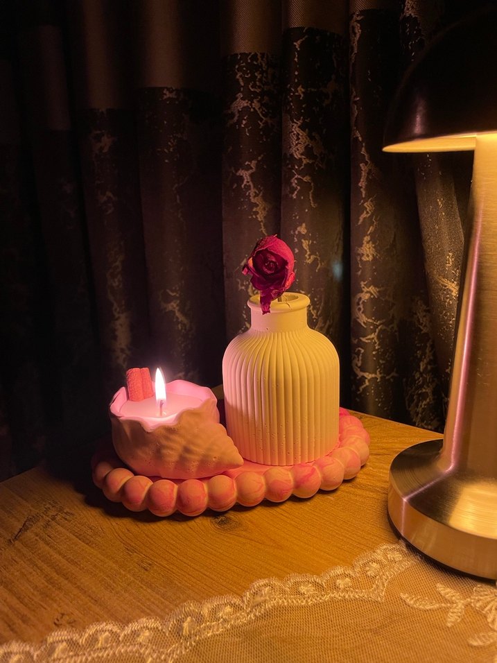 Pastel pembe renkte mum ve mumluk, üzerinde kuru çiçek bulunan çizgili vazo ile sıcak bir ortam yaratır. ️