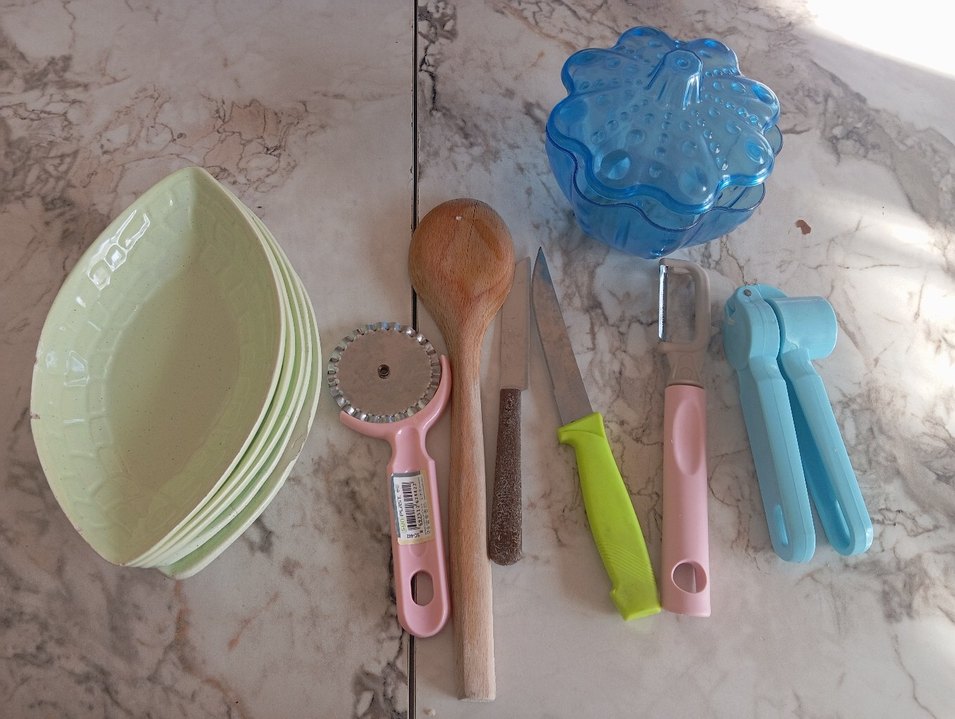 Pastel pembe renkli soyucu, kesme tekeri, tahta kaşık ve yeşil saplı bıçak ile birlikte mavi kapaklı bir mutfak kabı içerir.