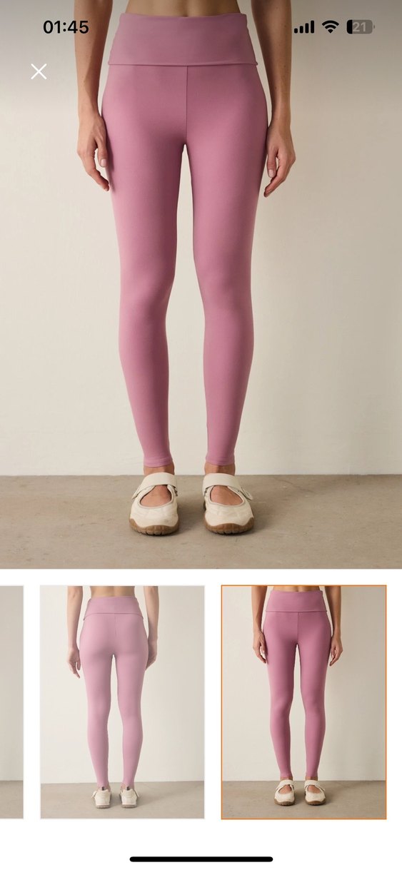 Pastel pembe, rubber benzeri kumaştan yapılmış, normal boy normcore tarzında, spor ve günlük kullanım için uygun, rahat ve şık kadın tayt.