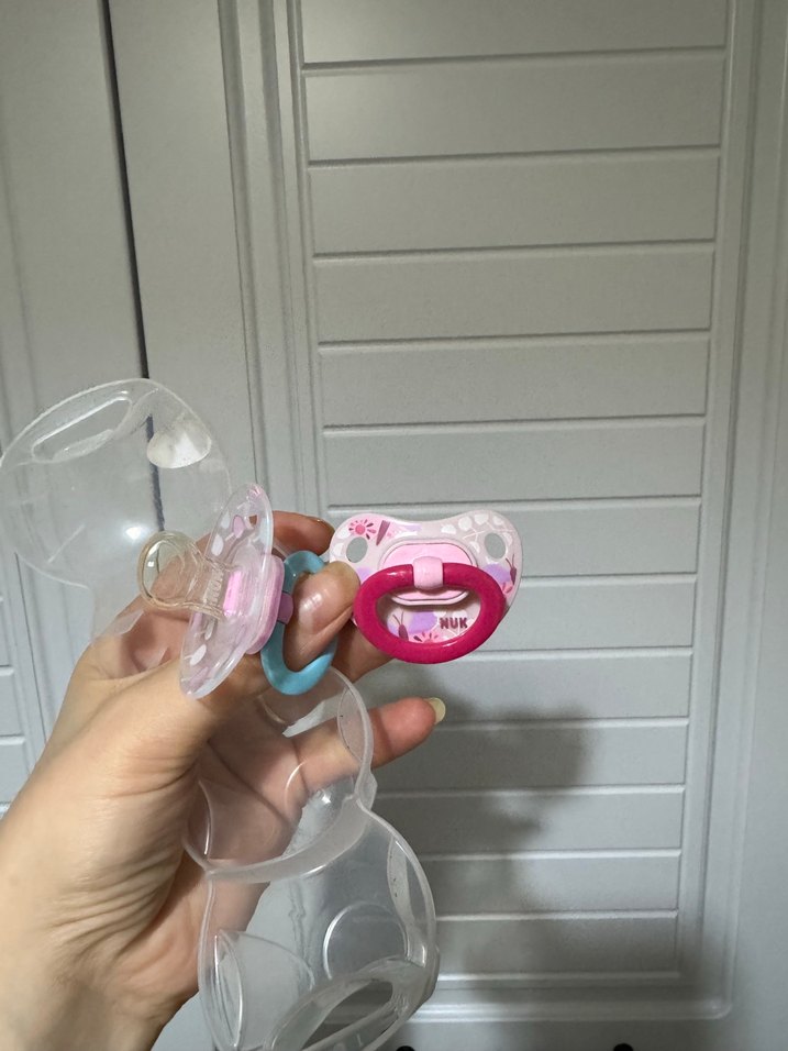 Pastel pembe renkte NUK markalı ergonomik yumuşak emzik, hijyen için koruyucu kapağa sahiptir. 2 adet emzik sıfır kullanılmadı