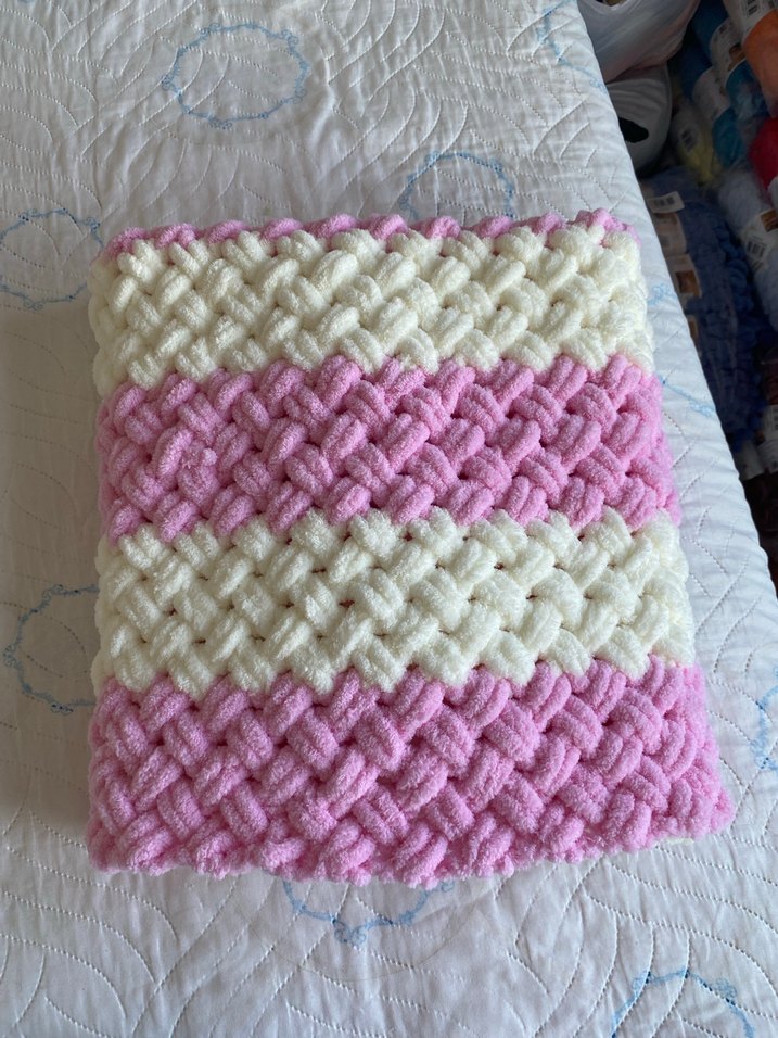 Yumuşak dokulu, pembe ve beyaz şeritlerden oluşan pastel pembe örgü çocuk battaniyesidir. Çocuklar için sıcaklık ve konfor sağlar.