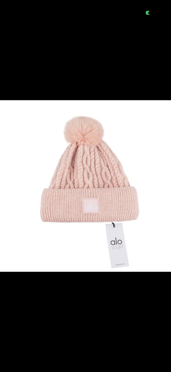 Pastel pembe örgü kadın bere, yumuşak ponpon ve Alo logosu ile, rahat örgü kumaştan yapılmıştır.