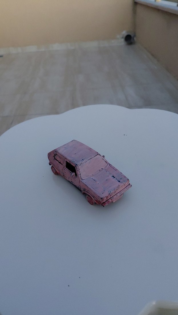 Pastel pembe renkte, klasik şekilli oyuncak araba. Hayal gücünü destekler.