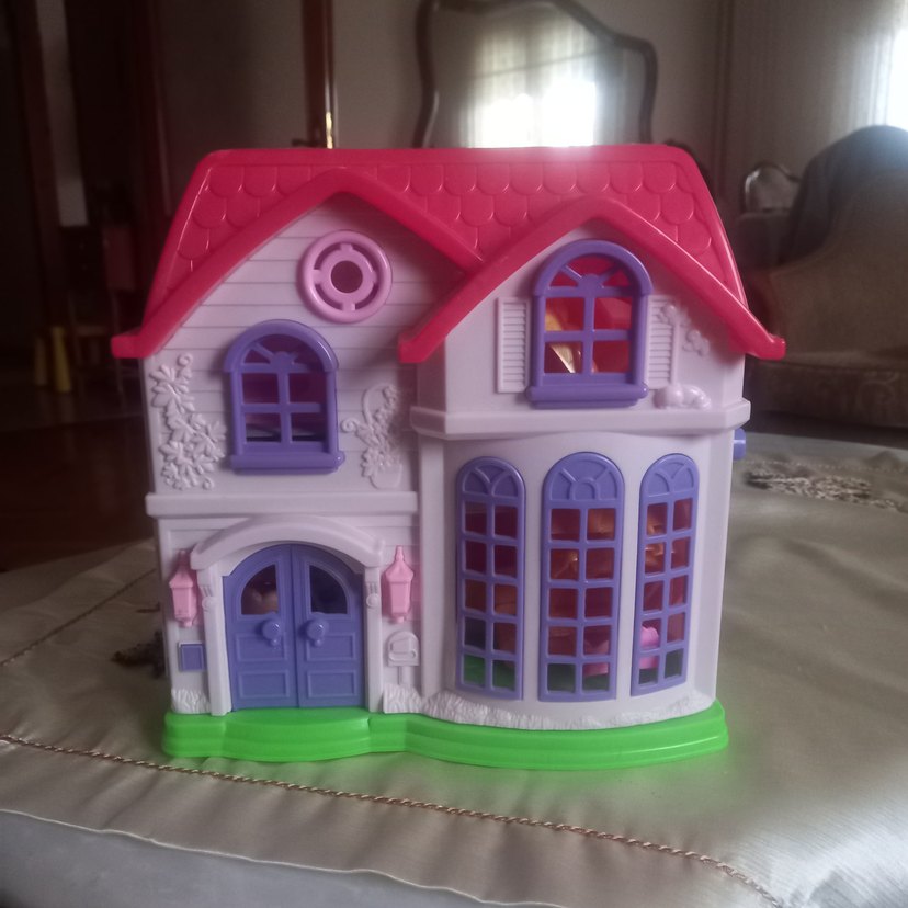 Pastel pembe oyuncak ev, mor pencereler ve kapılarla birlikte yeşil taban ve detaylı dış yüzeye sahiptir. Hayal gücünü destekler.