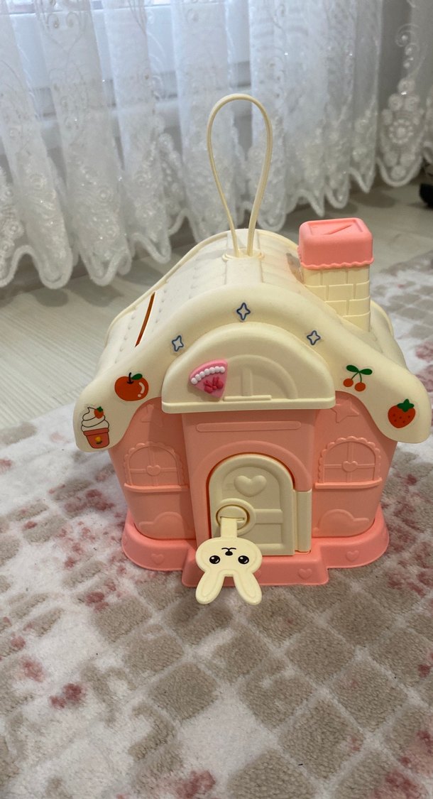 Pastel pembe renkli oyuncak ev, baca şeklinde para girişi ve sevimli tavşan şeklinde anahtara sahiptir. Önünde küçük meyve ve tatlı süslemeleri bulunur.