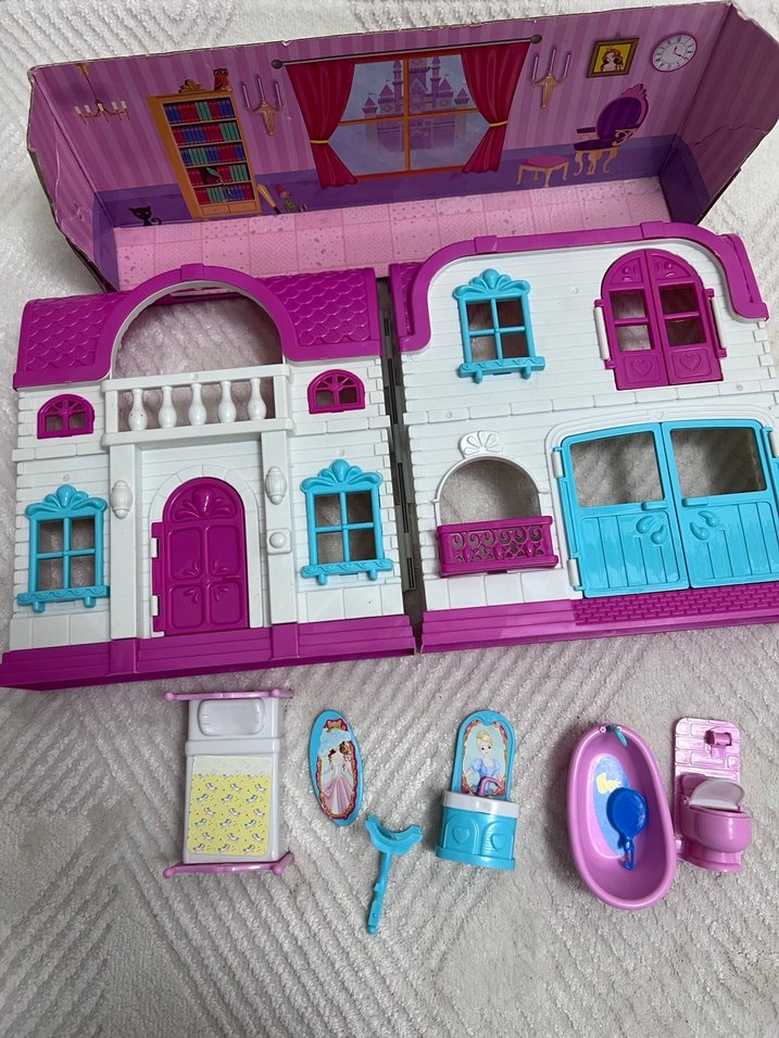 Pastel pembe renkli oyuncak ev seti, mavi ve pembe pencerelerle iki katlı ev ve küçük mobilya parçaları içerir. Ancak birkaç parça oyuncak eksık.