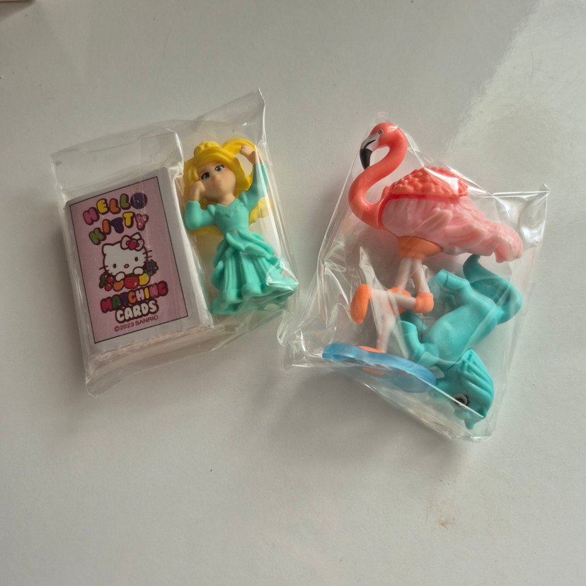 Pastel renkte oyuncak figürler ve Hello Kitty hafıza kartı oyun seti içerir. Figürler arasında turkuaz elbiseli kız, midilli ve flamingo bulunur.