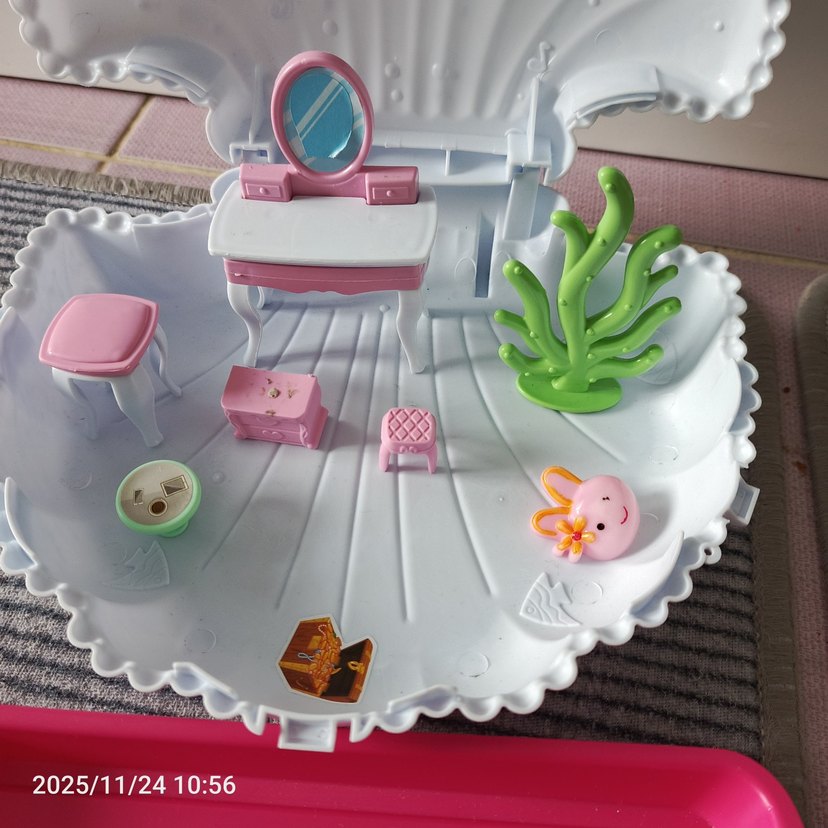 Pastel pembe renkli oyuncak makyaj setinde ayna, küçük tabure, sandık, bitki ve diğer minik aksesuarlar bulunur.
