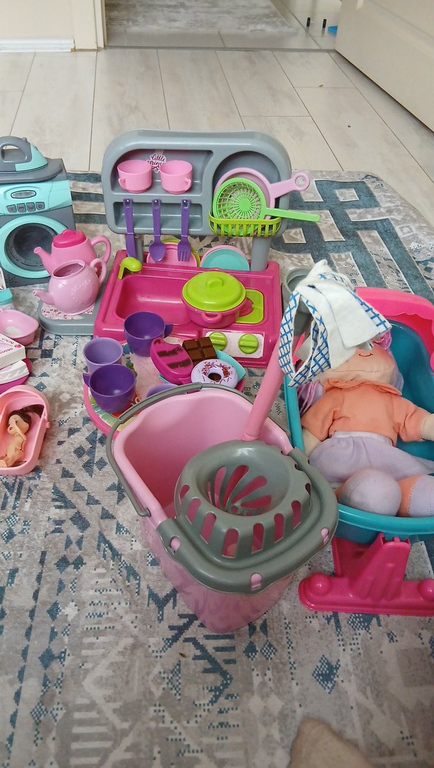 Pastel pembe oyuncak mutfak seti, çeşitli mutfak gereçleri ve bebek arabasında oyuncak bebek içerir. Bardaklar, tabaklar, çaydanlık ve temizlik araçları bulunur.
