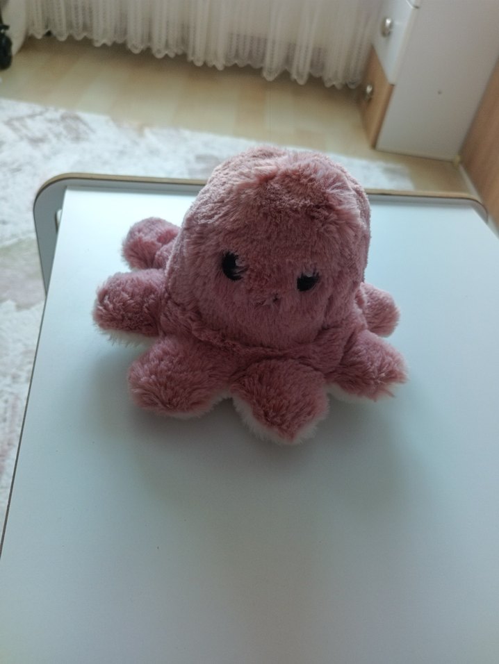 Yumuşak dokulu, pastel pembe peluş ahtapot oyuncak, işlenmiş gözlere sahiptir. Dekorasyon veya yumuşak arkadaş olarak kullanılabilir.