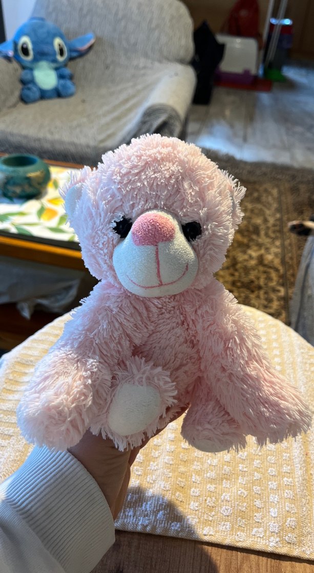 Yumuşak pastel pembe peluş ayıcık, sevimli yüzü ve küçük boyutuyla sarılmak için ideal.