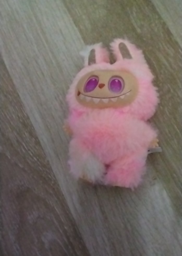 Pastel pembe renkte, benzersiz yüz ifadesi ve tavşan kulakları olan yumuşak peluş oyuncak. Labubu