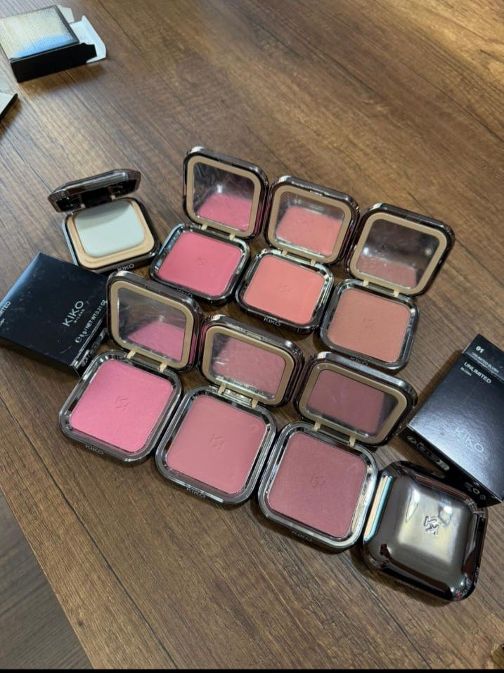 Çeşitli tonlarda pastel pembe pudra kompaktlarından oluşan bir set, makyajınıza yumuşak bir dokunuş katmak için ideal.