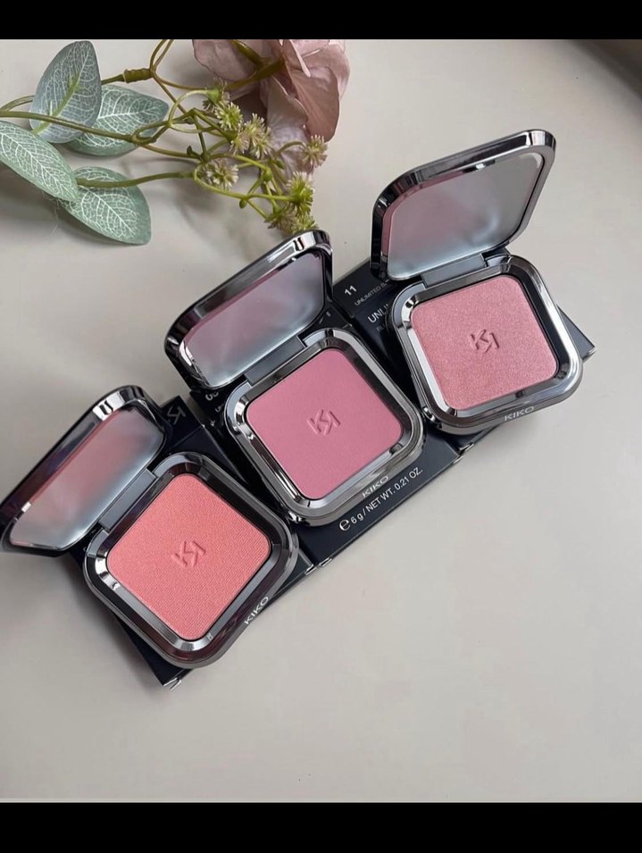 Üç farklı pastel pembe tonunda pudra seti, kare kompaktlarda ve aynalı kapaklıdır. Doğal ve yumuşak bir görünüm için uygundur.