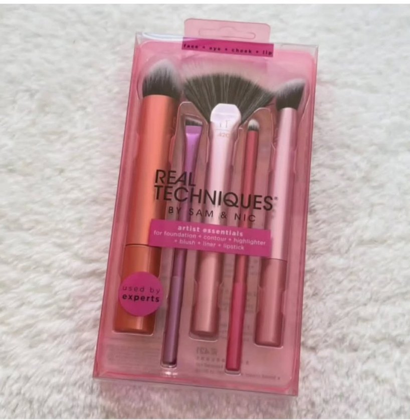 Pastel pembe Real Techniques makyaj fırça seti, fondöten, kontür, aydınlatıcı, allık, eyeliner ve ruj için fırçalar içerir. Uzmanlar tarafından kullanılır.