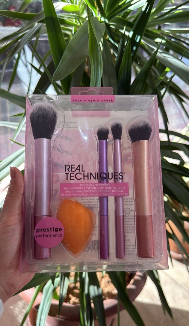 Pastel pembe tonlarda Real Techniques makyaj fırçası seti; yüz, göz ve yanak için üç fırça ve bir karıştırma süngeri içerir. ️
