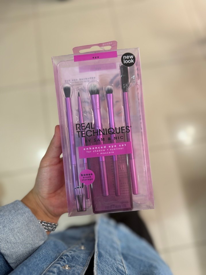 Pastel pembe renkte, göz farı, eyeliner ve maskara uygulaması için Real Techniques makyaj fırça seti. Yeni görünüm ve ekstra araçlar içerir.