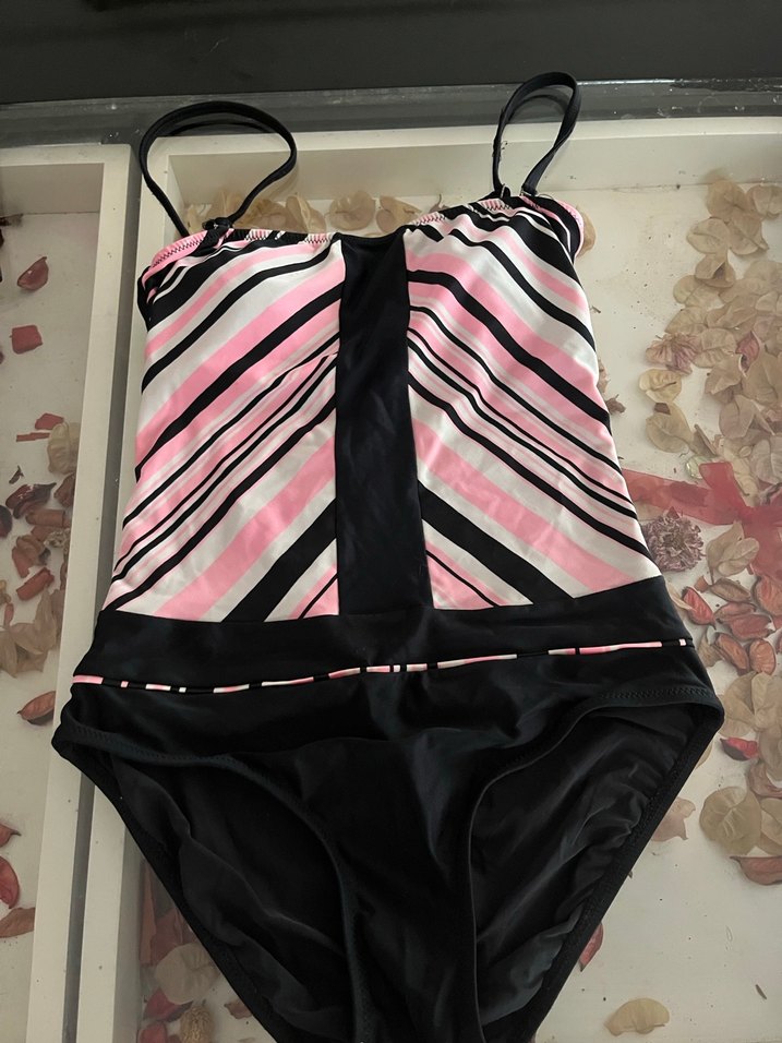 Kadın mayo, pembe çizgili desenli,hem straplez hem de askılıdır. Normal kesim ve çağdaş athleisure tarzıyla plaj için uygundur.