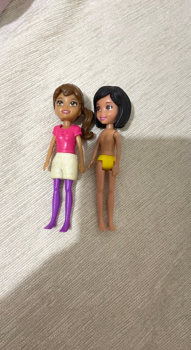 Pastel pembe tonlarında, biri pembe üst ve beyaz etek ile mor çoraplı, diğeri sarı şortlu iki bebek figürü.