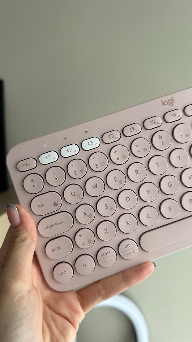 Logitech klavye, pastel pembe renkte yuvarlak tuşlara sahiptir. Standart tuşlar ve fonksiyon kısayolları içerir, rahat yazım sağlar. Bluetoothlu.