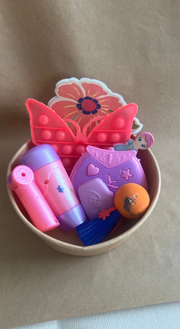 Kelebek pop-it, küçük bebek, oyuncak saç kurutma makinesi ve diğer eğlenceli parçalar içeren pastel pembe oyuncak seti.