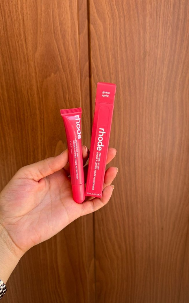 Rhode markasına ait pastel pembe dudak parlatıcısı, canlı parlaklık ve yumuşak doku sunar. Dudak rengini pastel tonlarda belirginleştirir.