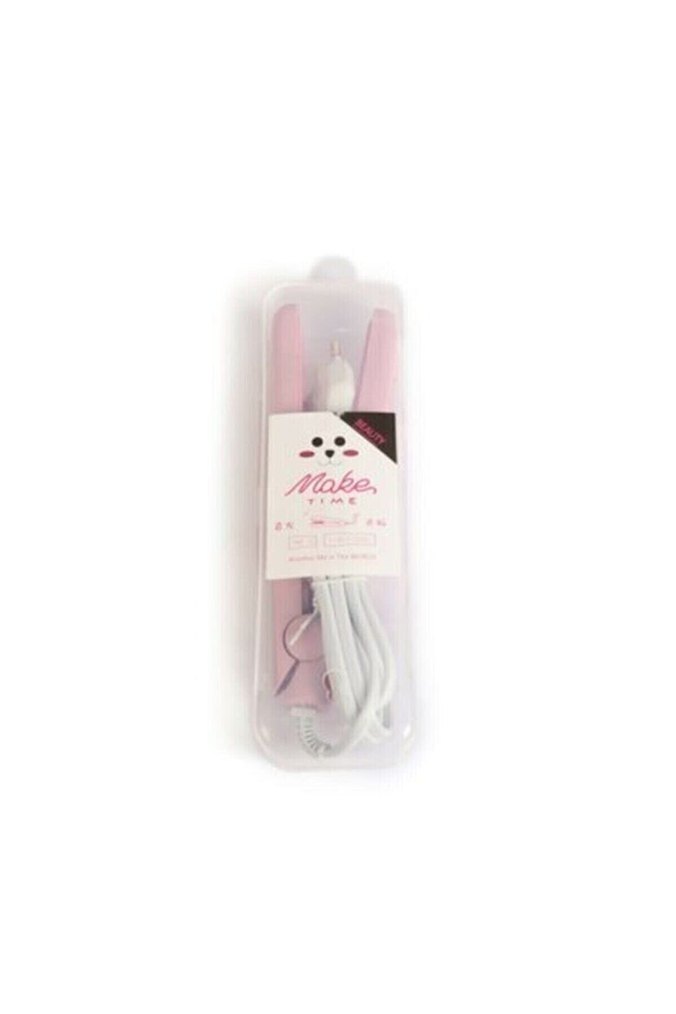 Pastel pembe saç düzleştirici, beyaz kablo ve şeffaf kutu içinde. Üzerinde "Make Time" etiketi bulunur. ✨