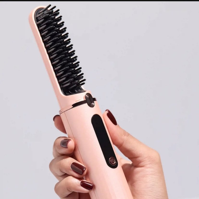 Pastel pembe renkte, dijital ekranlı, saç düzleştirici fırça.