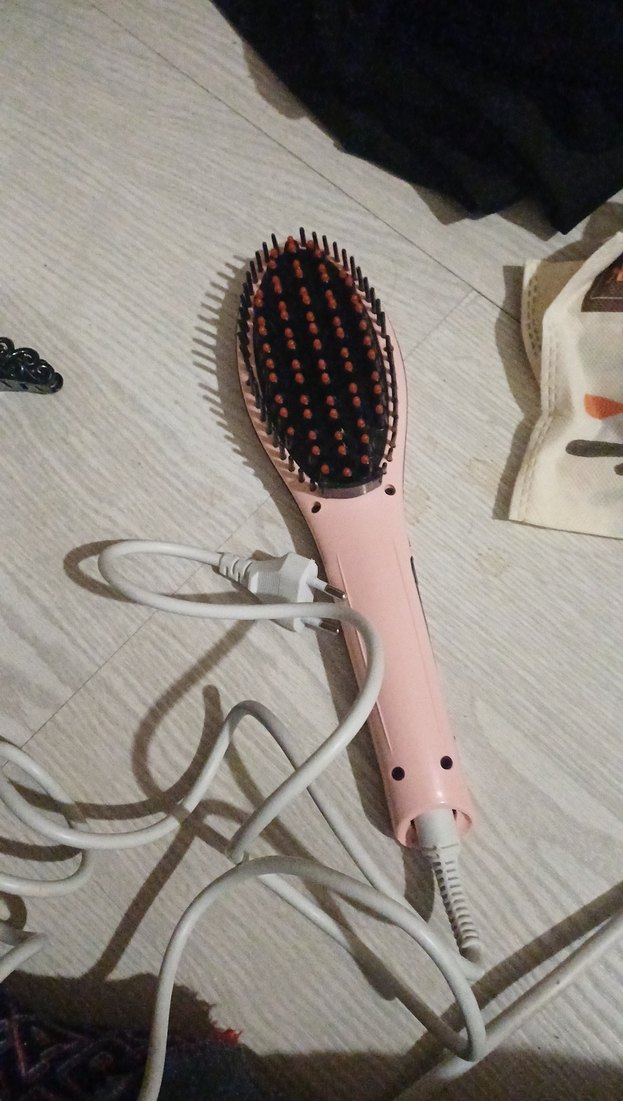 Pastel pembe renkte, saçları düzleştirmek için tasarlanmış dişli saç düzleştirici fırça. Kullanımı kolay, ergonomik saplı ve kablolu. 1 2 kere kullandım özellikle seyahat için mükemmel