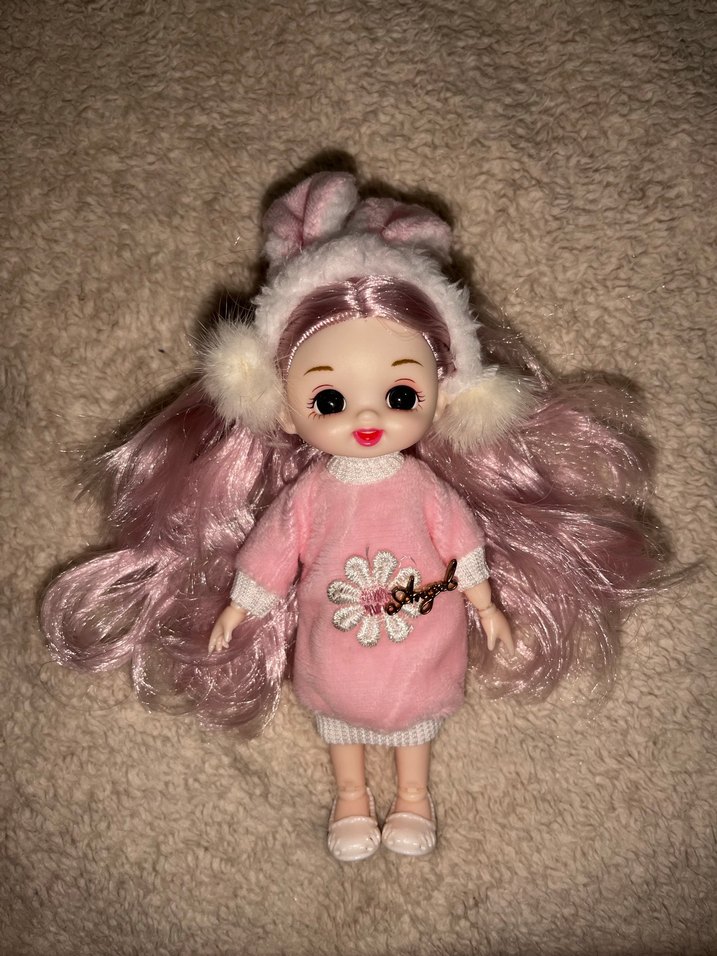 Uzun pastel pembe saçlı bebek, çiçek işlemeli yumuşak pembe elbise ve ponponlu kulaklıklı şapka ile.