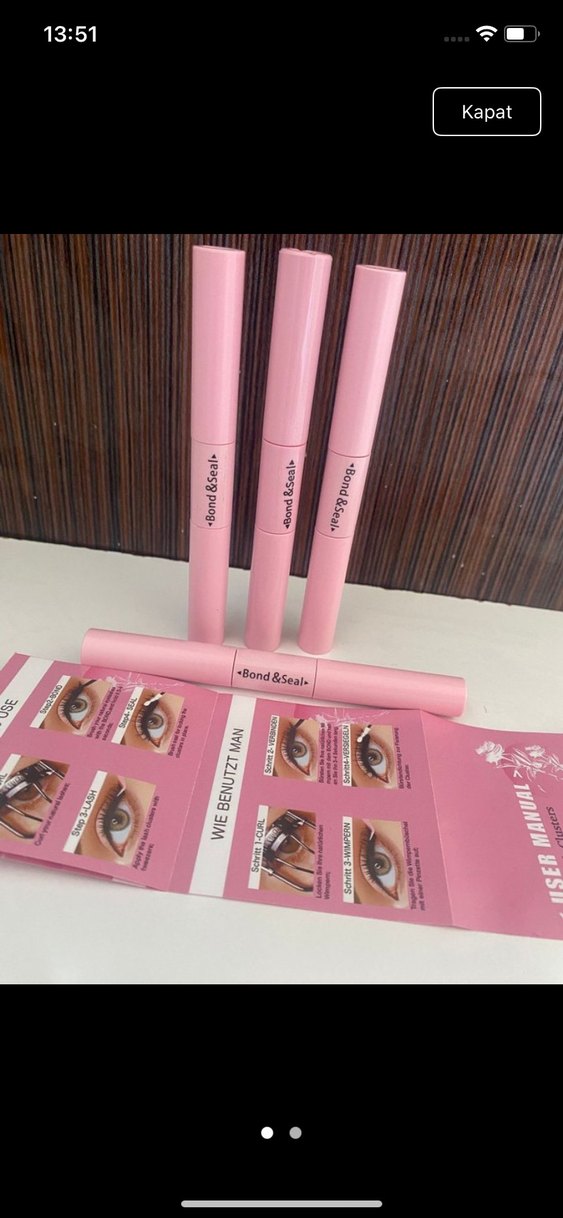 Bond&Seal etiketli pastel pembe sahte kirpik yapıştırıcı tüpleri ve kullanım kılavuzu. Kirpiklerin kolayca yapışmasını sağlar.