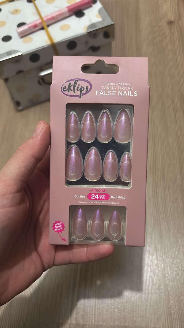 Eklips markasının pastel pembe, kedi gözü efektli 24 adet almend şekilli sahte tırnak seti. Zarif ve yumuşak bir görünüm sağlar.