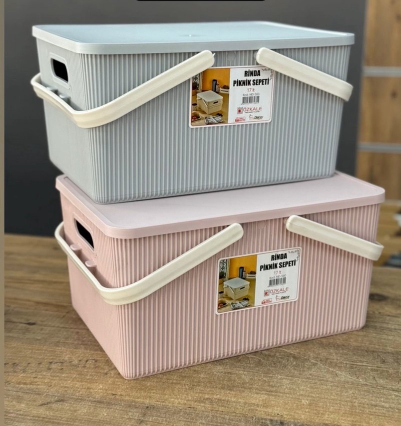 Pastel pembe renkli, dayanıklı saplı ve kabartmalı tasarıma sahip saklama sepeti. Piknik sepeti olarak etiketlenmiş, çok amaçlı kullanılabilir.