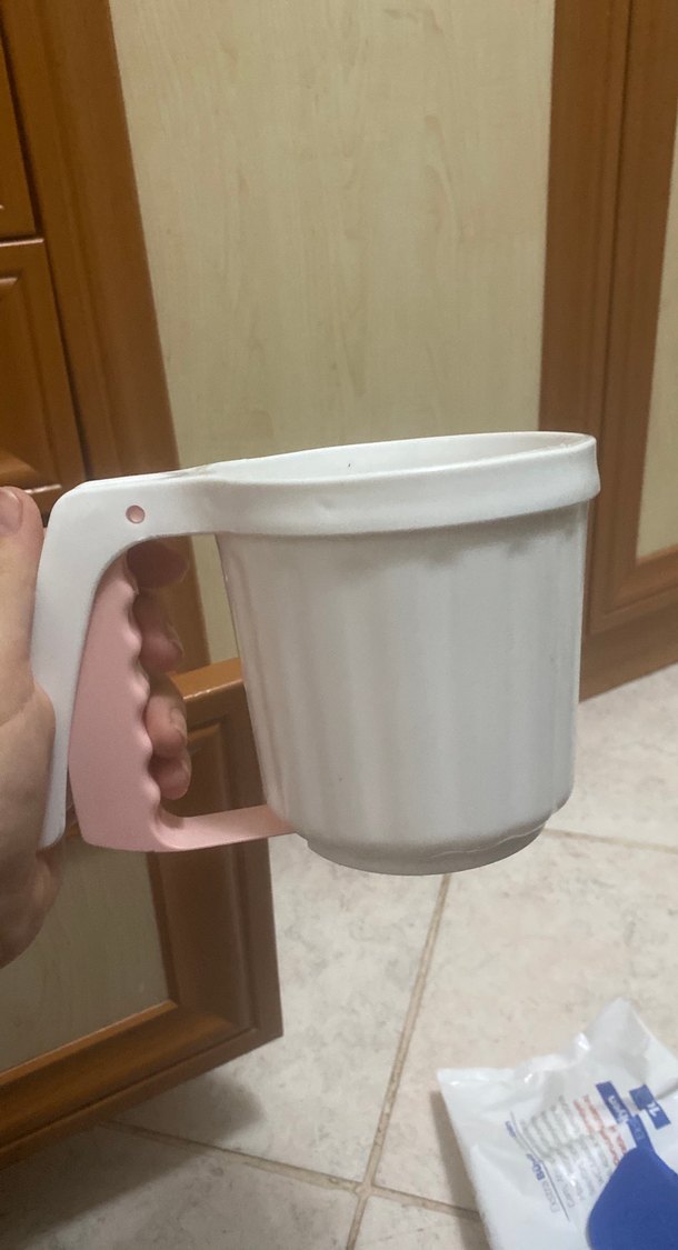 Pastel pembe saplı beyaz plastik kepçe, tutması kolaydır ve mutfakta kullanılabilir.