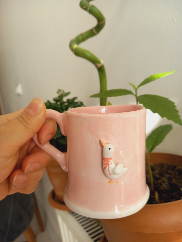 Pastel pembe seramik kupa, küçük bir ördek figürü bulunur. Ürün seramik olup tamamen el yapımı ve el boyamasıdır gıdaya uygundur elde yıkama önerilir. görselden bir tık daha canlı bir pembedir. 225 ml almadan önce mevcut olup olmadığını sorun
