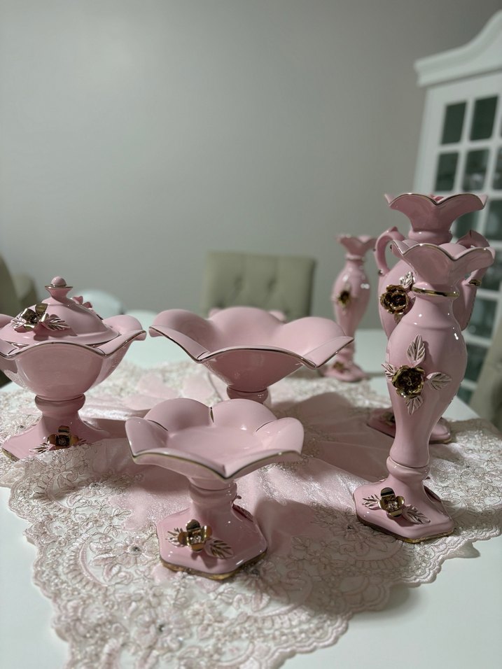 Pastel pembe seramik vazo seti, zarif çiçek detaylarıyla dekorunuza yumuşak bir dokunuş katıyor.