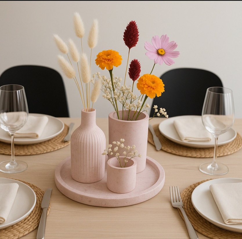 Pastel pembe seramikten yapılmış, üç farklı şekilli vazonun yer aldığı ve yuvarlak bir tepsi üzerinde sunulan set.