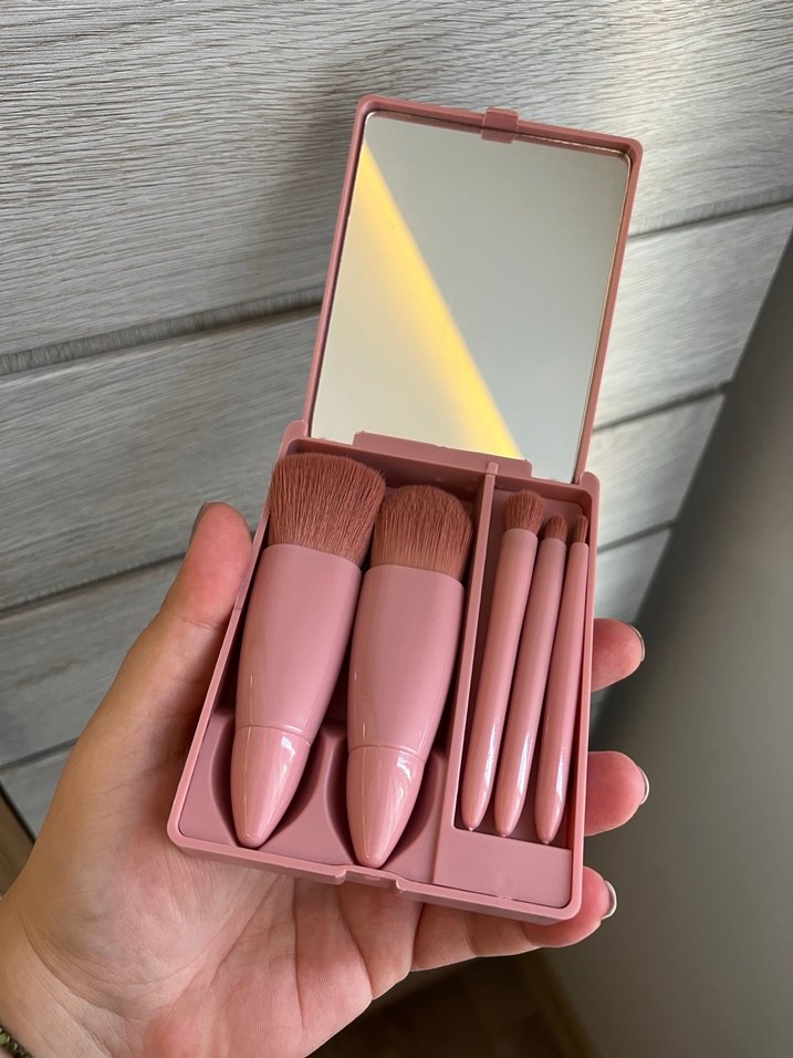 Hiç kullanılmadı. Pastel pembe renkte, içinde ayna bulunan kompakt kutuda beş adet makyaj fırçası seti.