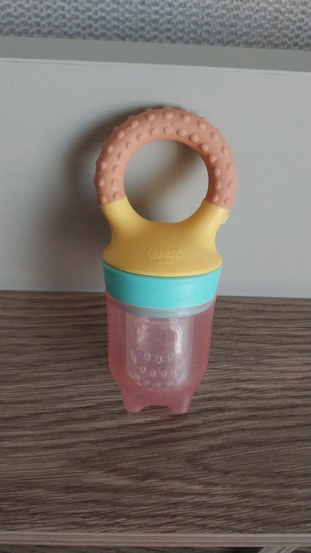 Pastel renklerde, silikon besleme ucu ve dokulu, kolay tutulan sapı olan pembe emzik.