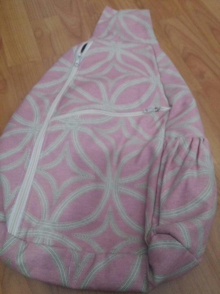 Yumuşak kumaşlı, dairesel desenli pastel pembe sırt çantası sling'i, önünde fermuarlı cep bulunur. rahat ve güvenlidir.